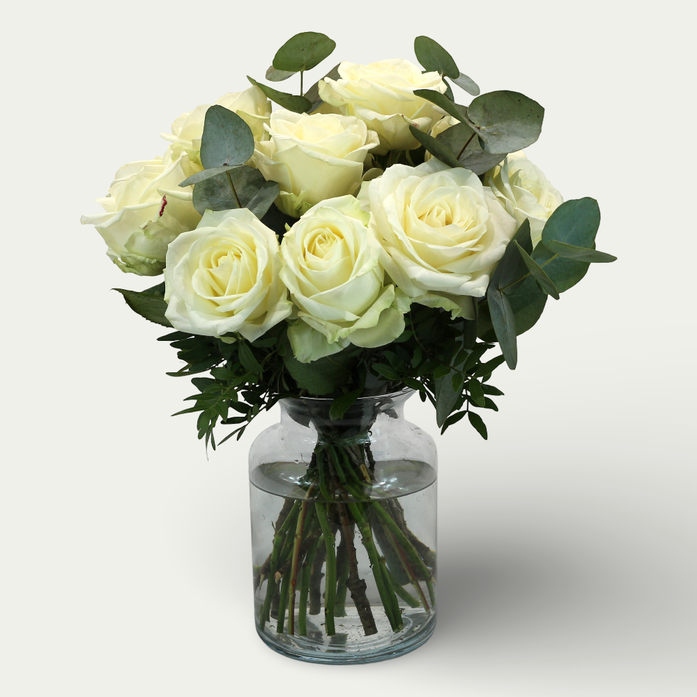 Ein zeitlos eleganter Strauß aus strahlend weißen Rosen, begleitet von frischem Eukalyptus und dem zarten Grün der Pistazie. Die schlichte Farbkombination strahlt Reinheit und Stil aus – ideal für festliche Anlässe, als edles Geschenk oder als stilvoller Blickfang im eigenen Zuhause.