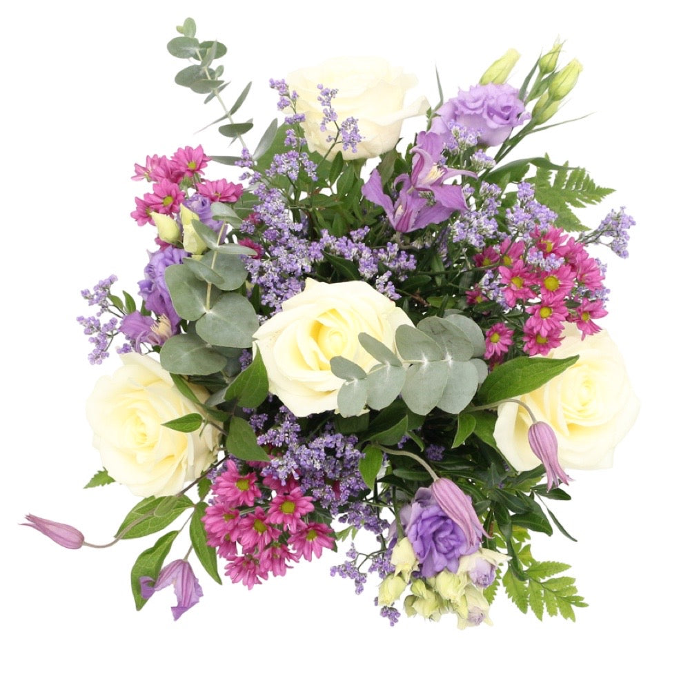 Ein lebendiger, natürlicher Strauß mit besonderem Charakter. Edle Rosen treffen auf zarte Eustoma und strukturreiche Chrysanthemen, die dem Arrangement Tiefe und Fülle verleihen. Feine Akzente aus Limonium und verspielter Clematis sorgen für eine luftige Leichtigkeit, während Eukalyptus und Farn dem Strauß eine frische, grüne Natürlichkeit schenken. Ein ausdrucksstarkes Bouquet – ideal für alle, die florale Vielfalt und einen modernen, dennoch zeitlosen Stil schätzen.